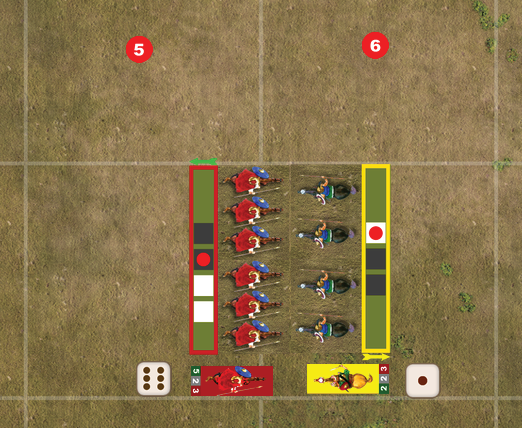 In melee combat MC score 3 hits against LC who score 2 hits back. Generals and commanders help in melee only by raising the highest shaken interval (the white squares) to firm, so in this case the LH lose two morale intervals and rout.